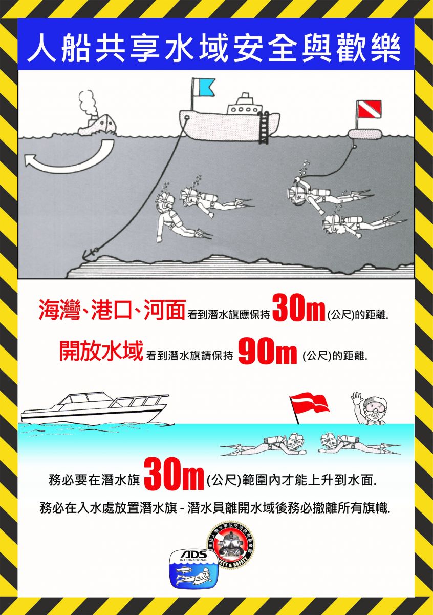 如果船友在海灣、海峽或海面有看到潛水旗,請讓你的船與潛水旗至少保持 30 公尺的距離。