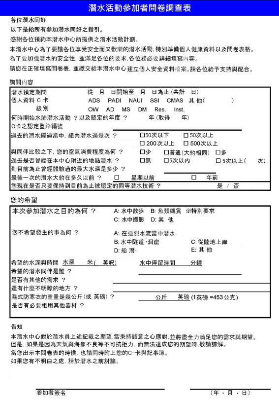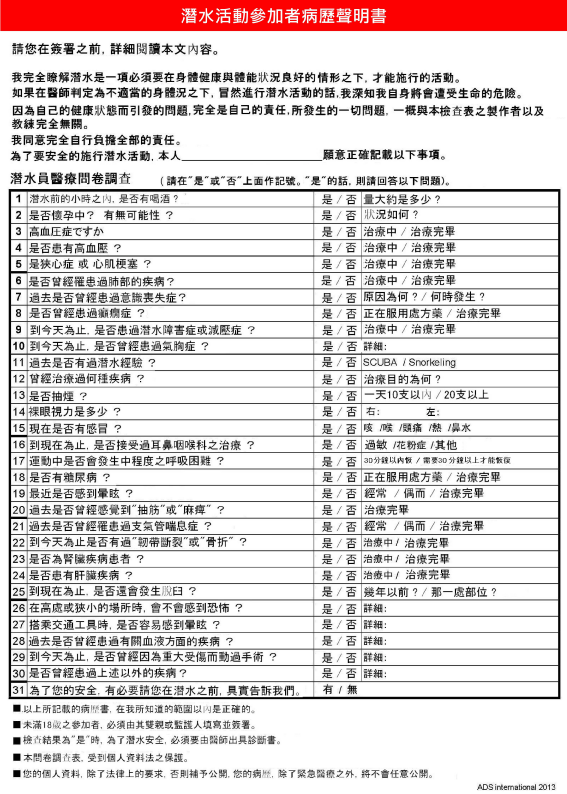 近年來,休閒潛水旅遊活動參與人口快速增加,持有潛水員資格證照之國外旅客數也大幅成長。為協助潛水事業經營者、潛水教練及導潛,能夠有效辨別潛水員之相關潛水資歷,以做為提供潛水事業相關服務前的潛水安全加強控管參考資料,ADS日本總部特別以日本國內現況(法律問題、商業習慣、賠償責任保險等)為依據。特別設計一式潛水活動參加者問卷調查表,供所屬教練參考使用。依照ADS日本總部對於各國使用之場合,請考量各國之國內情況(法律問題、商業習慣、賠償責任保險等)後,活用之。ADS台灣地區總管理處,已將潛水活動參加者問卷調查表之中文正體版譯本,置於教練專區供教練下載參考使用。